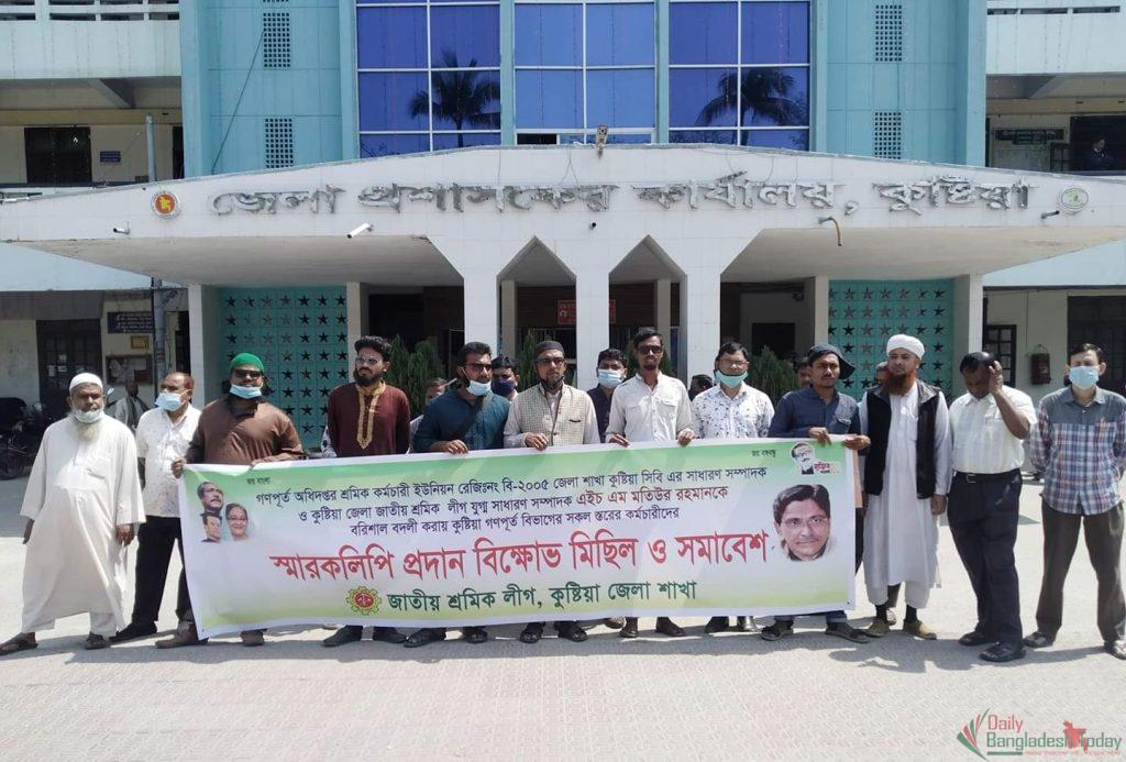 তার পাশাপাশি মতিউর রহমানের বদলির আদেশ প্রত্যাহারের দাবিতে জাতীয় শ্রমিক লীগ কুষ্টিয়া জেলা শাখা নেতৃবৃন্দ ও শ্রমিক-কর্মচারীরা কুষ্টিয়া জেলা প্রশাসকের অফিসের সম্মুখে মানববন্ধন ও বিক্ষোভ সমাবেশ করেন। বিক্ষোভ সমাবেশ শেষে জেলা প্রশাসক মহোদয় পিএ মো: খাযইরুল ইসলামের হাতে জাতীয় শ্রমিক লীগের সাধারণ সম্পাদক আমজাদ আলী খানের স্বাক্ষরিত একটি স্মারকলিপি হস্তান্তর করেন।