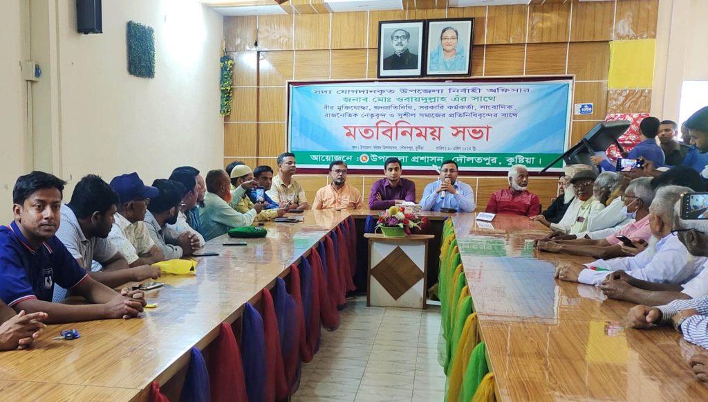 হেলাল উদ্দিন দৌলতপুর (কুষ্টিয়া) :- কুষ্টিয়ার দৌলতপুরে বীর মুক্তিযোদ্ধা, জনপ্রতিনিধি, সরকারি কর্মকর্তা, সাংবাদিক ও সুশীল সমাজের প্রতিনিধিদের সাথে মতবিনিময় করেছেন নবাগত উপজেলা নির্বাহী অফিসার (ইউএনও) মো. ওবায়দুল্লাহ।