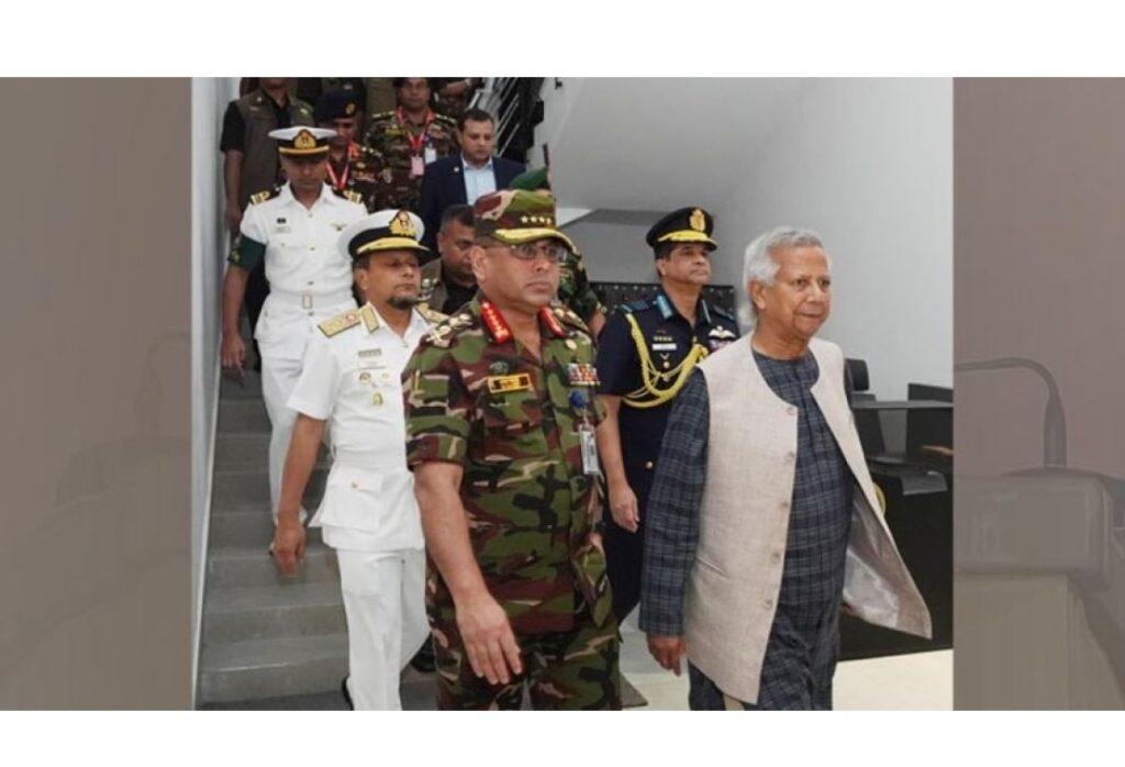 রোববার প্রধান উপদেষ্টা সেনাসদরে এসে পৌঁছালে বাহিনীর প্রধান জেনারেল ওয়াকার-উজ-জামান তাকে স্বাগত জানান।