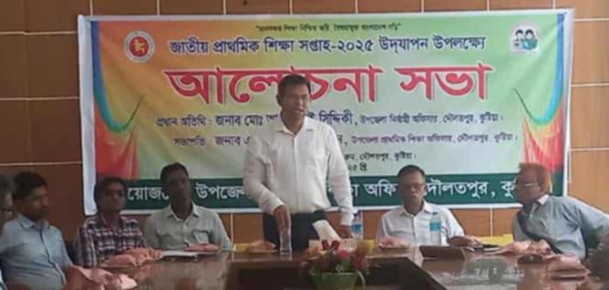 শনিবার দুপুর ১২ টায় দৌলতপুর উপজেলা পরিষদ কনফারেন্স রুমে উপজেলা প্রাথমিক শিক্ষা কর্মকর্তা মোঃ আব্দুর রহমানের সভাপতিত্বে এ উপলক্ষে আয়োজিত অনুষ্ঠানে প্রধান অতিথি হিসেবে উপস্থিত থেকে বক্তব্য রাখেন দৌলতপুর উপজেলা নির্বাহী কর্মকর্তা মোঃ আব্দুল হাই সিদ্দিকী।