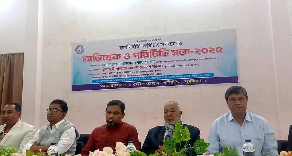 দৌলতপুর (কুষ্টিয়া) প্রতিনিধি ফরিদ আহমেদ :- কুষ্টিয়া শিল্পকলা একাডেমি মিলনায়তনে আড়ম্বরপূর্ণ পরিবেশে অনুষ্ঠিত হলো দৌলতপুর সমিতির কার্যনির্বাহী কমিটির সদস্যদের অভিষেক ও পরিচিতি সভা। সংগঠনটির নবনির্বাচিত সদস্যদের আনুষ্ঠানিকভাবে বরণ করে নেওয়া এবং তাদের মধ্যে সৌহার্দ্যপূর্ণ সম্পর্ক স্থাপন করাই ছিল এই সভার মূল লক্ষ্য।