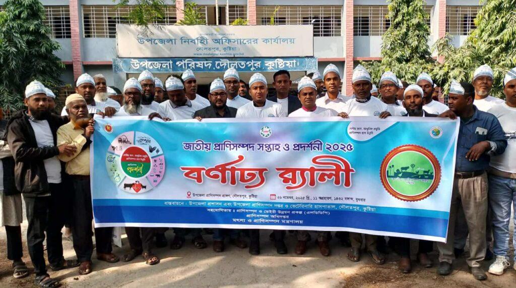 দৌলতপুর(কুষ্টিয়া) প্রতিনিধি ফরিদ আহমেদ :- “দেশীয় জাত আধুনিক প্রযুক্তি, প্রাণিসম্পদে হবে উন্নতি” এই প্রতিপাদ্য বিষয়কে সামনে রেখে কুষ্টিয়ার দৌলতপুর উপজেলা প্রশাসন ও প্রাণিসম্পদ দপ্তর ও ভেটেরিনারি হাসপাতালের আয়োজনে গত বুধবার বেলা ১১টায় প্রাণিসম্পদ চত্বরে জাতীয় প্রাণিসম্পদ সপ্তাহ ও প্রদর্শনীর আয়োজনে র্যালী ও আলোচনা সভা অনুষ্ঠিত হয়।