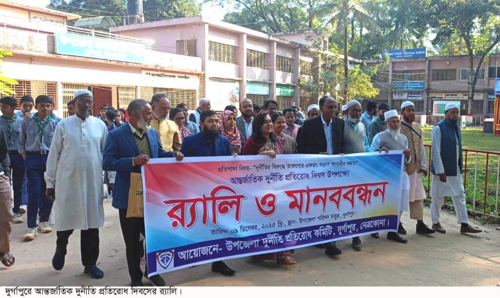 দুর্গাপুর (নেত্রকোনা) প্রতিনিধি:– দুর্নীতির বিরুদ্ধে তারুন্যের একতা : গড়বে আগামীর শুদ্ধতা এই প্রতিপাদ্যে নেত্রকোনার দুর্গাপুরে আন্তর্জাতিক দুর্নীতি প্রতিরোধ দিবস পালিত হয়েছে।