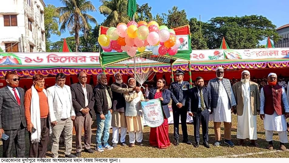 দুর্গাপুর (নেত্রকোনা) প্রতিনিধি:- নেত্রকোনার দুর্গাপুরে উপজেলা প্রশাসনের আয়োজনে প্রত্যুষে ৩১বার তোপধ্বনির মাধ্যমে যথাযোগ্য মর্যাদায় মহান বিজয় দিবস পালিত হয়েছে। মঙ্গলবার দিনব্যাপি নানা আয়োজনে এ দিবস পালিত হয়।