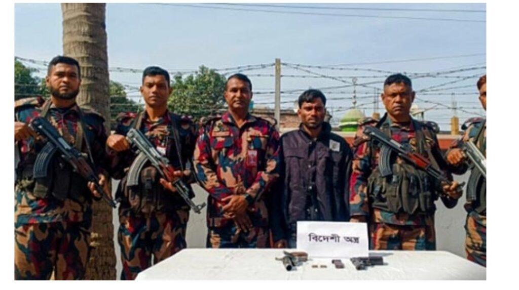 কুষ্টিয়া দৌলতপুর প্রতিনিধি:- কুষ্টিয়ার দৌলতপুর সীমান্তের ফিলিপ নগরের ইসলামপুর গ্রাম থেকে ১অস্ত্রচোরাকারবারী কে ১টি বিদেশী পিস্তল, ১টি ম্যাগাজিন, ২ রাউন্ড গুলি এবং ১টি দেশীয় শুটার গান সহ আটক করেছে বিজিবি।