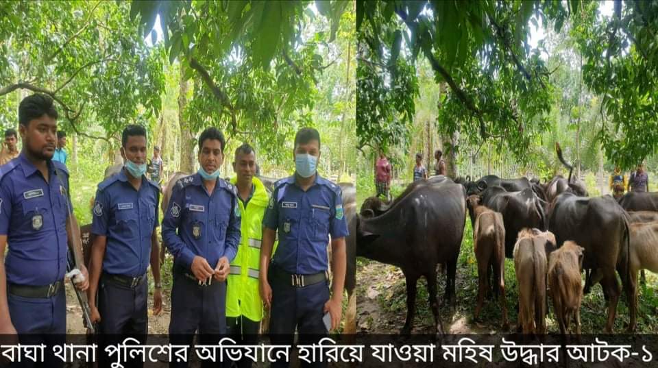 রাজশাহীর পুলিশ সুপার এ বি এম মাসুদ হোসেন বিপিএম(বার) এর নির্দেশনায় বাঘা থানার চৌকস অফিসার ইনচার্জ (ওসি) নজরুল ইসলাম এর নেতৃত্বে, এসআই মামুনুর রশীদ সহ সঙ্গীয় পুলিশ ফোর্স মধ্য রাত হতে সকাল পর্যন্ত অভিযান পরিচালনা করে। পরে পুঠিয়া থানা পুলিশকে অবহিত করে তাদের সহায়তা নিয়ে পুঠিয়া থানা থেকে চোরাইকৃত ১২ টি মহিষ উদ্ধারপূর্বক চুরির প্রধান আসামীকে আটক করেন। আটককৃত আসামী হলেন, জাহাঙ্গীর (৩০),পিতা: হাসেম খামারু। আটককৃত জাহাঙ্গীর মহিষ খামার মালিক আশরাফ ঘোষের রাখাল ছিলেন বলে জানা যায়।