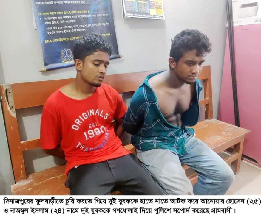 ফুলবাড়ী (দিনাজপুর) প্রতিনিধি:- দিনাজপুরের ফুলবাড়ীতে দিনের বেলায় চুরি করতে গিয়ে দুই যুবককে হাতে নাতে আটক করে গণধোলাই দিয়ে থানায় সপোর্দ করেছেন বাড়ীর মালিকসহ এলাকাবাসী। বৃহস্পতিবার বিকেল সাড়ে চারটার দিকে পৌর শহরের মধ্য গৌরীপাড়া গ্রামের ছামছুদ্দিন এর বাড়ীতে এ ঘটনা ঘটে।