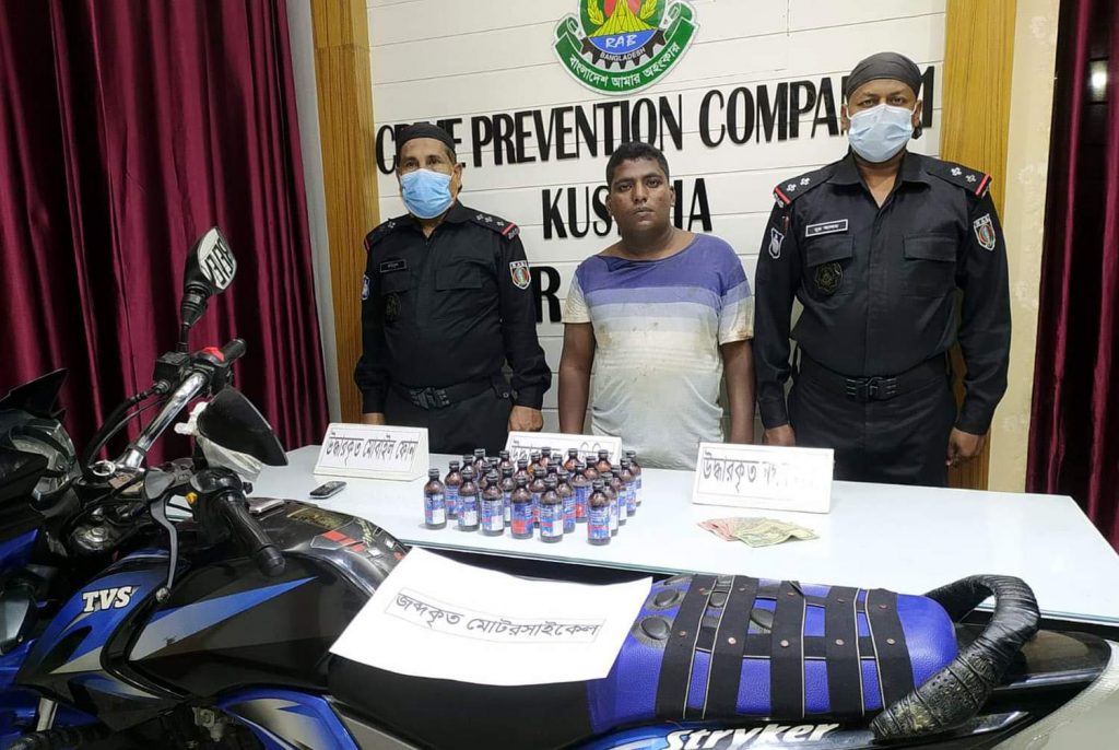 র্যাব সূত্রে জানাযায়, ২৩ সেপ্টেম্বর ২০২১ ইং তারিখ সন্ধ্যা সাড়ে ৭টার সময় ‘‘ দৌলতপুর থানাধীন মাষ্টার পাড়া গ্রামস্থ সাদিকুজ্জামান খান সুমন এর বাড়ির সামনে পাঁকা রাস্তার উপর’’ একটি মাদক বিরোধী অভিযান পরিচালনা করে। উক্ত অভিযানে ২৮ বোতল ফেন্সিডিল, ১টি মোবাইল ফোন, ২টি সীমকার্ড, নগদ-৯৪০ টাকা, ০১টি মোটরসাইকেল সহ আসামী রাকিবুল ইসলাম (২৬), পিতা-জিয়ারুল ইসলাম, সাং দৌলতপুর বিলপাড়া, থানা দৌলতপুর, জেলা-কুষ্টিয়া’কে গ্রেফতার করা হয়।