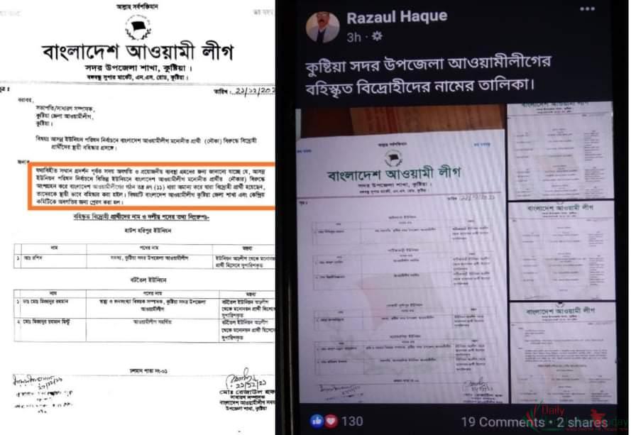 অথচ চিঠিতে সুস্পষ্ট লেখা আছে যে তাদেরকে স্থায়ীভাবে বহিষ্কার করা হল। উক্ত চিঠি জেলা আওয়ামী লীগের কাছে প্রেরণ করেছেন সেখানে উল্লেখ আছে স্থায়ী বহিষ্কার প্রসঙ্গে।বহিষ্কারের বিষয়ে সাধারণ সম্পাদক তার ফেসবুক পেজে একটি স্ট্যাটাস দিয়েছেন সেখানে লেখা আছে ‘কুষ্টিয়া সদর উপজেলা আওয়ামী লীগের বহিস্কৃত বিদ্রোহীদের নামের তালিকা’।